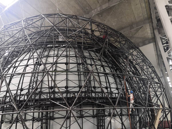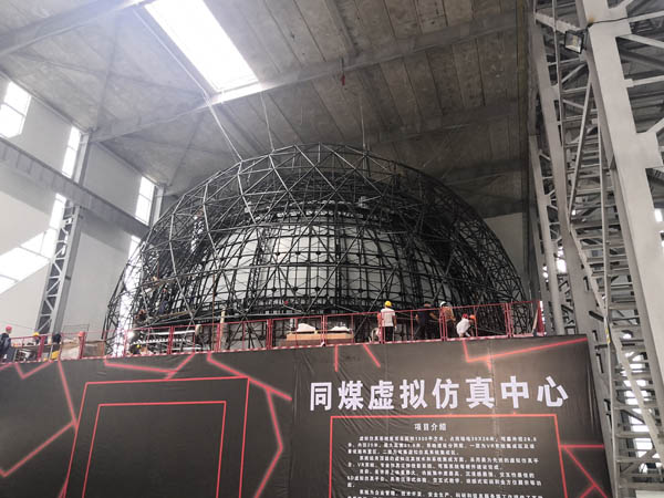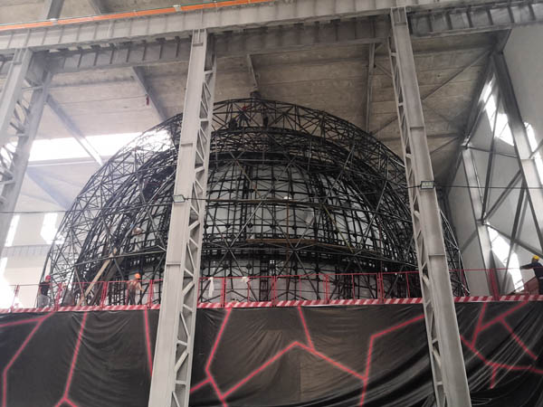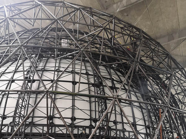 同煤集團全息AR展示中心項目,單層不銹鋼網(wǎng)架直徑28米,網(wǎng)架采用單層聯(lián)方網(wǎng)格且有內(nèi)伸三角錐裝飾,桿與球表面采用鍍鈦處理,網(wǎng)架內(nèi)襯藍天白云鋁板裝飾,在國內(nèi)屬首創(chuàng)。